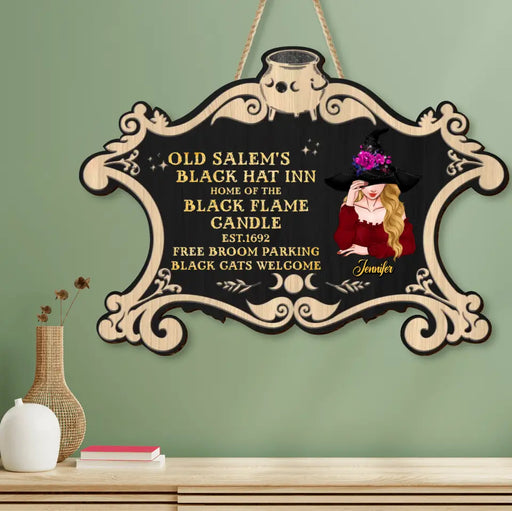 View full detailsCustom Personalized Witch Wooden Sign - Gift Idea For Halloween/Witch/Pagan Decor - Old Salem's Black Hat Inn Home Of The Black Flame Candle