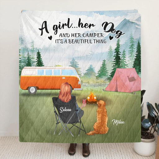 Personalized Dog Mom Camping Quilt/Fleece Blanket - Mom With Up to 4 Dogs - Best Gift For Dog Lovers