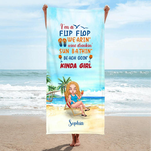 View full detailsPersonalized Camping Beach Towel - Gift Idea For Beach Lover - I'm A Flip Flop Wearin' Wine Drinkin' Sun Bathin' Beach Goin' Kinda Girl