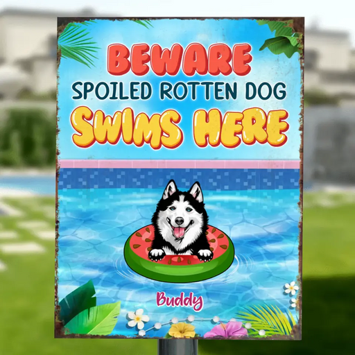 View full detailsPersonalized Dog Metal Sign - Up to 6 Dogs - Gift Idea for Dog Lovers - Beware Spoiled Rotten Dog Swims Here