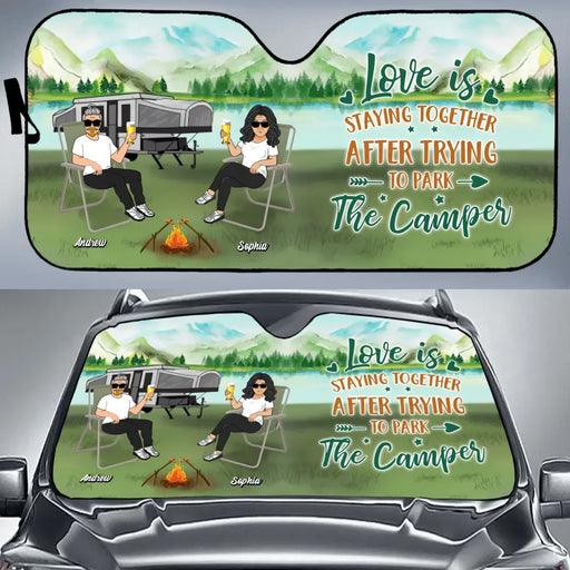 View full detailsPersonalized Camping Windshield Sunshade - Couple With Up to 4 Pets- Gift Idea For Camping/Dog/Cat Lovers - Love Is Staying Together After Trying To Park The Camper