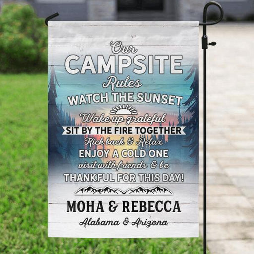 View full detailsPersonalized Camping Garden Flag - Gift For Couple, Camping Lovers - Our Campsite Rules Watch The Sunset