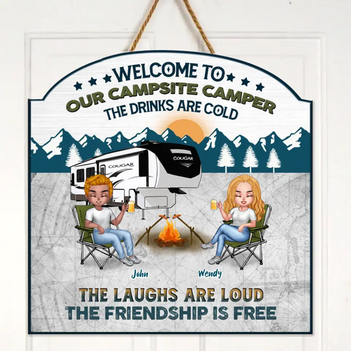 View full detailsPersonalized Camping Friends/Couple Wooden Sign - Up to 7 People - Gift Idea For Friends/Camping Lover - Welcome To Our Campsite Camper The Drinks Are Cold The Laughs Are Loud