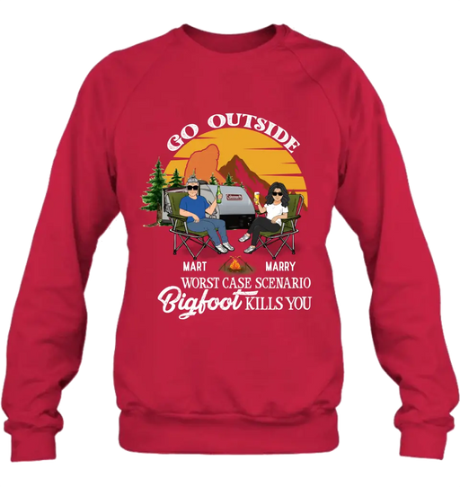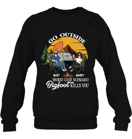View full detailsPersonalized Couple Camping Shirt/Pullover Hoodie/Long sleeve/Sweatshirt - Gift Idea For Camping Lover - Go Outside Worst Case Scenario Bigfoot Kills You
