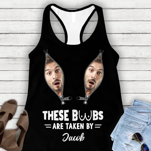 View full detailsPersonalized Funny Photo AOP Women's Racerback Tank Top - Funny Gift Idea for Couple/Her - These Boobs Are Taken By