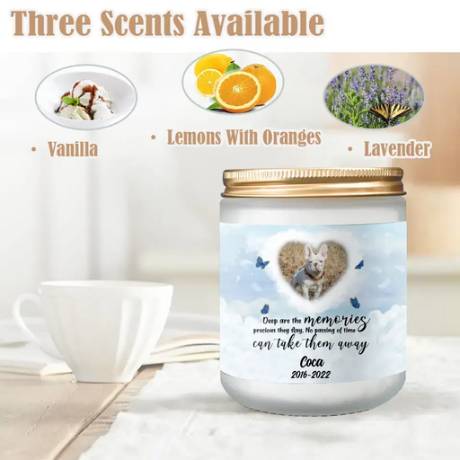 View full detailsCustom Personalized Memorial Pet Loss Photo Candle - Memorial Gift Idea - Deep Are The Memories Precious They Stay. No Passing Of Time Can Take Them Away