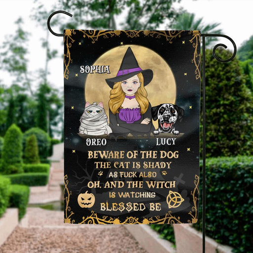 View full detailsPersonalized Witch Flag - Up to 4 Pets - Halloween Gift Idea For Friends/Dog/Cat Lovers - Beware Of The Dog The Cat Is Shady As Fuck Also
