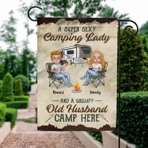 Personalized Camping Couple Flag Sign - A Super Sexy Camping Lady And A Grumpy Old Husband Camp Here 🏕️ A Fun & Unique Gift for Camping Couples...