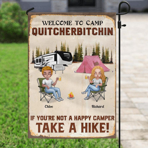 View full detailsCustom Personalized Welcome To Camp Quitcherbitchin Flag Sign - Gift Idea For Camping Lovers - Up To 6 People - If You're Not A Happy Camper Take A Hike!