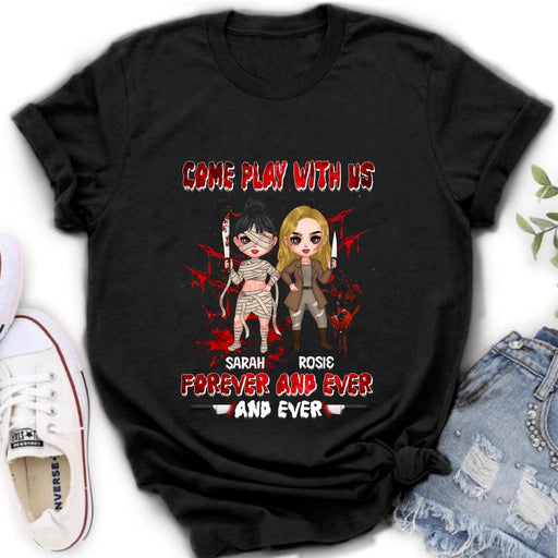 View full detailsCustom Personalized Besties T-shirt/Sleeve/Sweatshirt/Hoodie - Halloween Gift for Best Friends - Up to 4 Besties - Come play with us forever and ever and ever