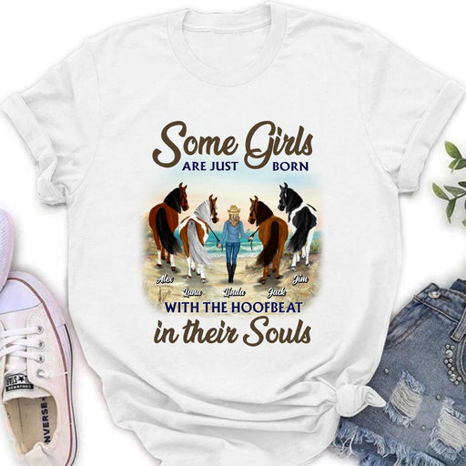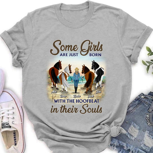 View full detailsPersonalized Horse Lady Unisex T-shirt/ Hoodie/ Sweatshirt - Gift Idea For Horse Lovers with up to 4 Horses - Some Girls Are Just Born With The Hoofbeat In Their Souls