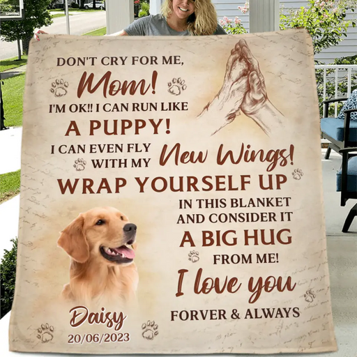 View full detailsPersonalized Memorial Dog Photo Quilt/Fleece Throw Blanket - Memorial Gift Idea for Dog Owners - Don't Cry For Me Mom! I'm Ok!