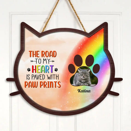 Custom Cat Photo Wooden Sign - up to 5 Photos - Gift Idea For Cat Lover - The Road To My Heart Is Paved With Paw Prints