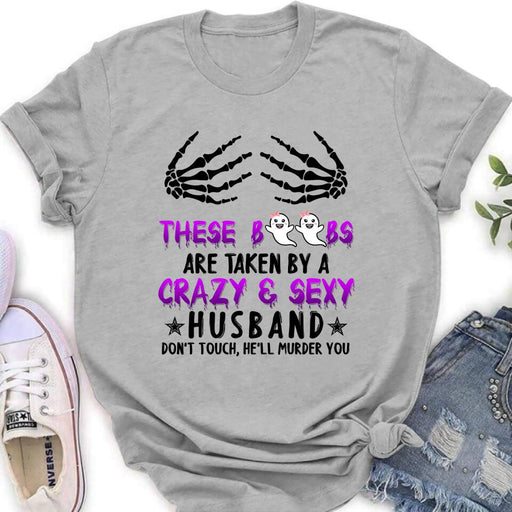 View full detailsPersonalized Halloween T-shirt/Long Sleeve/Sweatshirt - Gift Idea For Halloween - These Boobs Are Taken By A Crazy & Sexy Husband