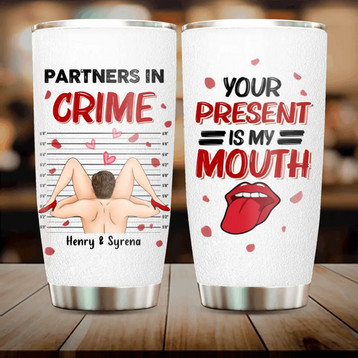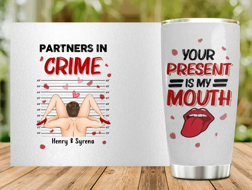 View full detailsPersonalized Partners In Crime Tumbler 20oz - Your Present Is My Mouth - Gift Idea For Her/ Couple/ Anniversary